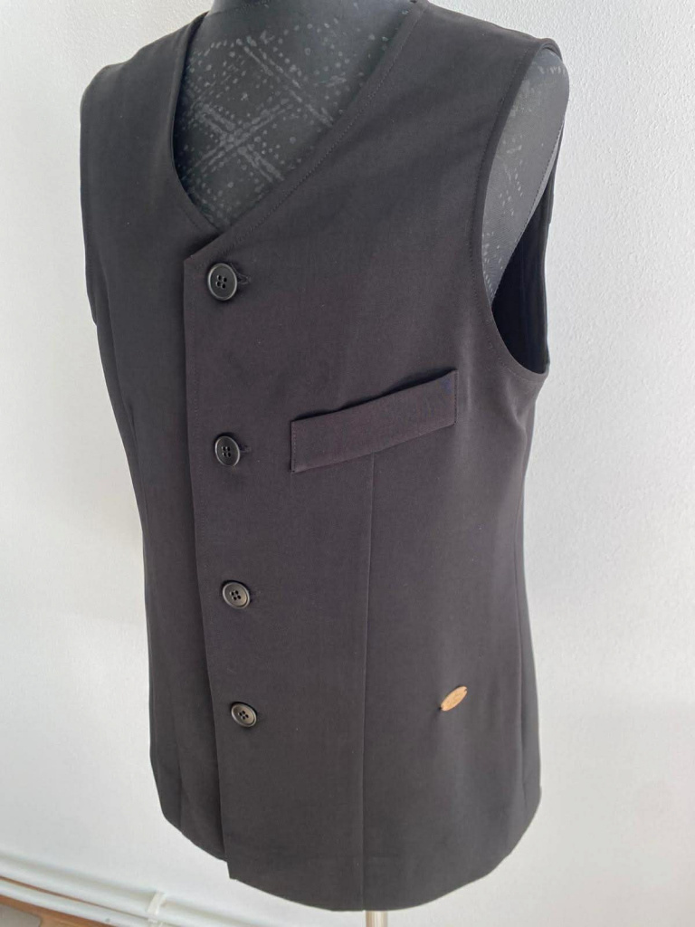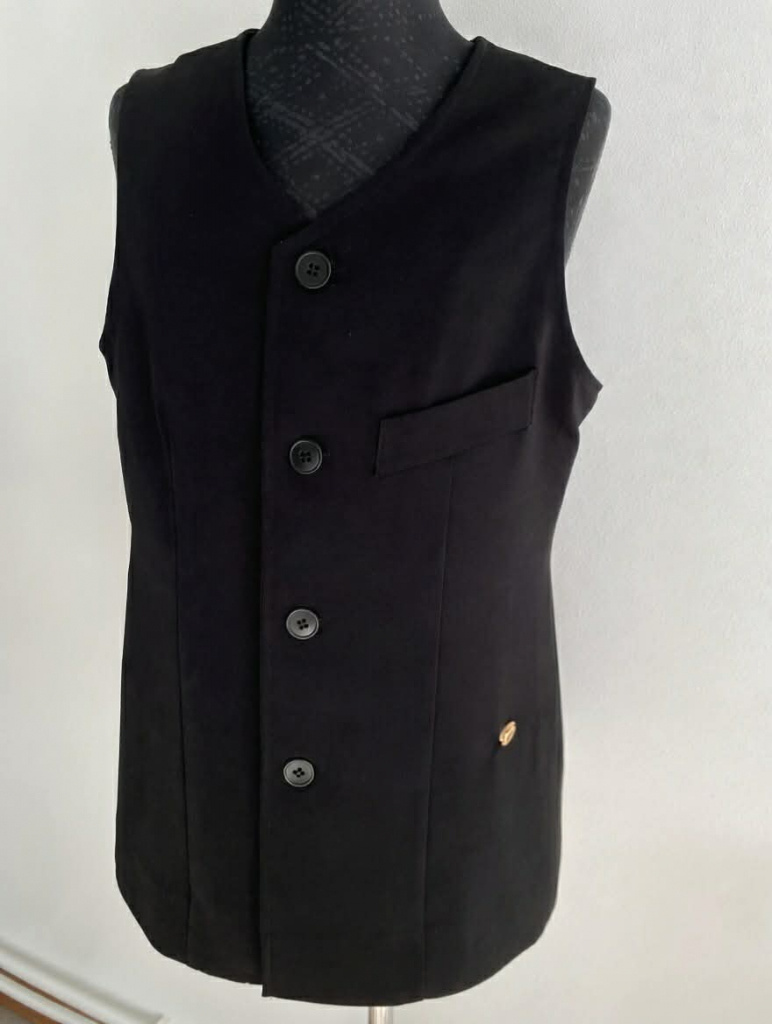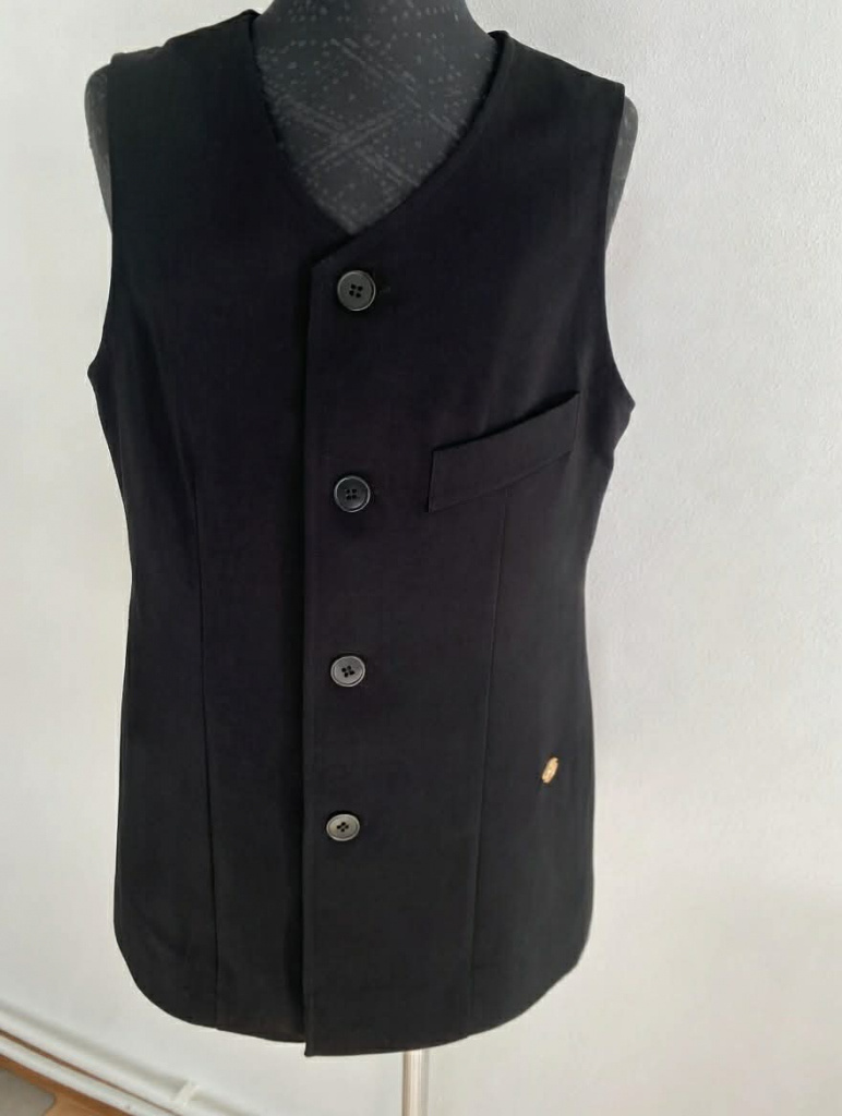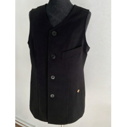 chlapčenská vesta z materiálu angelika, má výstrih do písmena V s jednorádovým zapínaním a náprstným falošným vreckom.